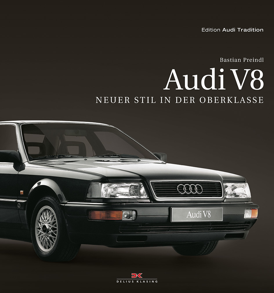 Bibliografie: Audi V8 – Neuer Stil in der Oberklasse, Autor: Bastian Preindl, 192 Seiten, 244 Farbfotos, 19 S/W Fotos, 59 farbige Abbildungen, 1 Karte, 280 x 302 mm, gebunden mit Schutzumschlag, 39,90 €, Verlag: Delius Klasing, ISBN: 978-3-7688-3752-1