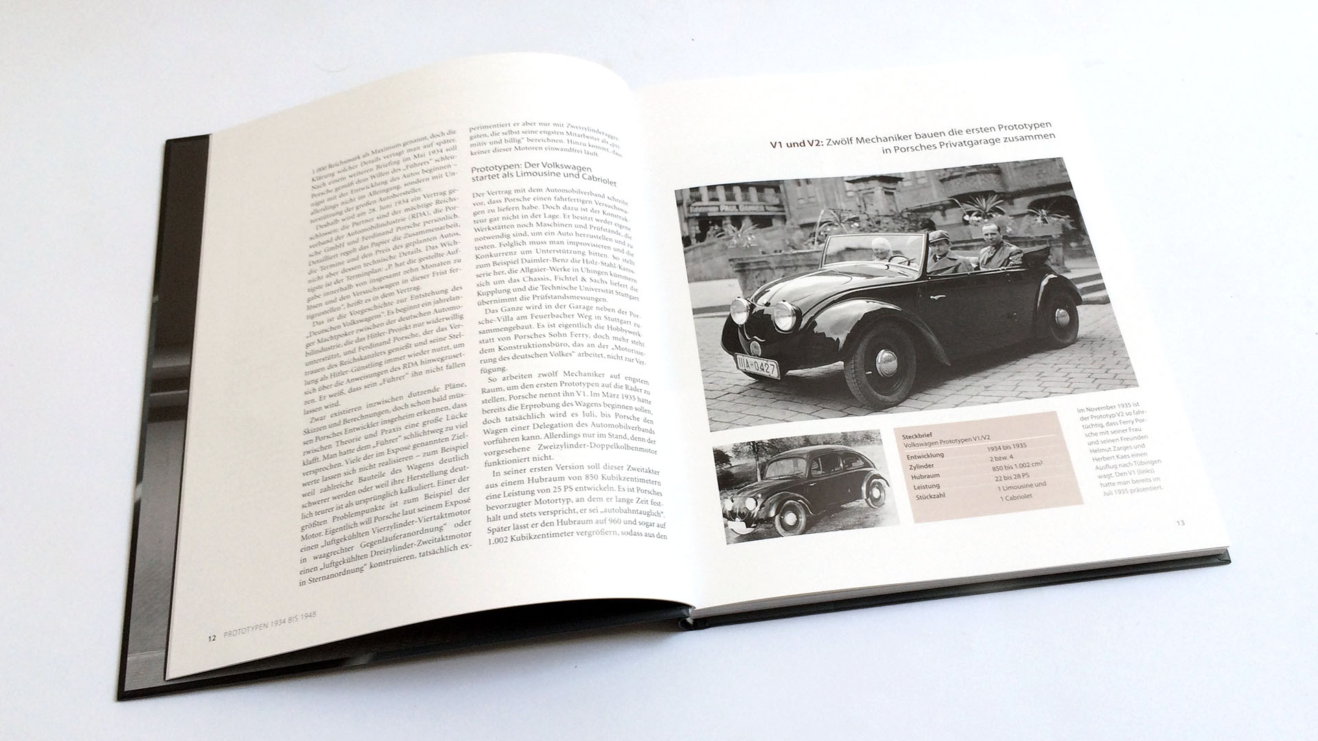 Das erste Kapitel zeigt dann den Weg „Von V1 zum VW“ auf und wirft einen intensiven Blick auf die Entstehungsgeschichte der Marke Volkswagen und die dabei entstandenen Prototypen auf dem Weg zum Käfer. Dabei werden auch die Unterbrechung durch den zweiten Weltkrieg und die so entstandenen Käfer-Derivaten nicht verschwiegen, sondern konsequent aufgearbeitet. Auch der Typ 60 K10 besser bekannt als Berlin-Rom-Wagen von Porsche wird ebenso erwähnt wie der Stromlinen-Wagen auf Käfer-Basis V2 Sagitta von Kurt C. Volkhart.