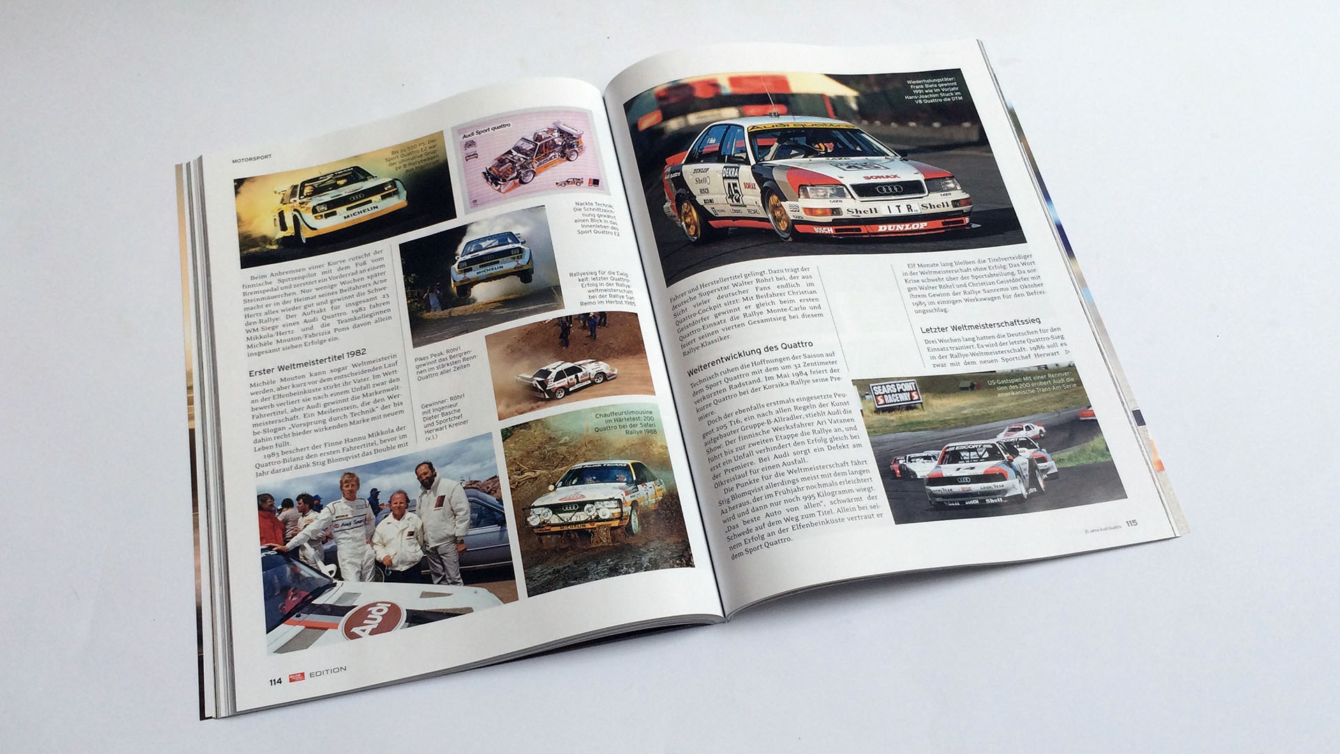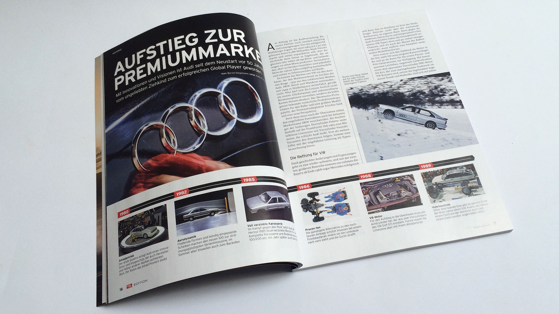 Wie wichtig auch der Motorsport für Audi wurde zeigt ein achtseitiger Bericht über die Geschichte vom Rallye-Ur-quattro bis hin zum aktuellen Le Mans-Rennwagen. Dabei setzte Audi fortwährend auf den Allradantrieb, sowohl in der Rallye-WM, der DTM, der IMSA und TransAm und auch in der STW. Bis dieser hier schließlich verboten wurde. In Le Mans hat Audi inzwischen mit Allradantrieb beeindruckende 13 Siege eingefahren und ist somit in direkter Schlagdistanz zur Marke mit den meisten Siegen – Porsche.