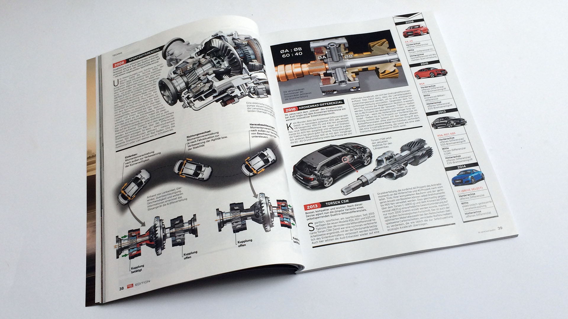 Die detaillierte technische Weiterentwicklung des Allradantriebes wird in einem Artikel von Klaus-Ulrich Blumenstock deutlich. Mit kurzen, aber durchaus prägnanten Texten werden die wichtigsten Entwicklungen bis hin zum aktuellen Torsen CSM vorgestellt. Unterstützt durch aussagekräftige technische Abbildungen lässt sich so die Entwicklung des Allradantriebs bei Audi hervorragend nachvollziehen.