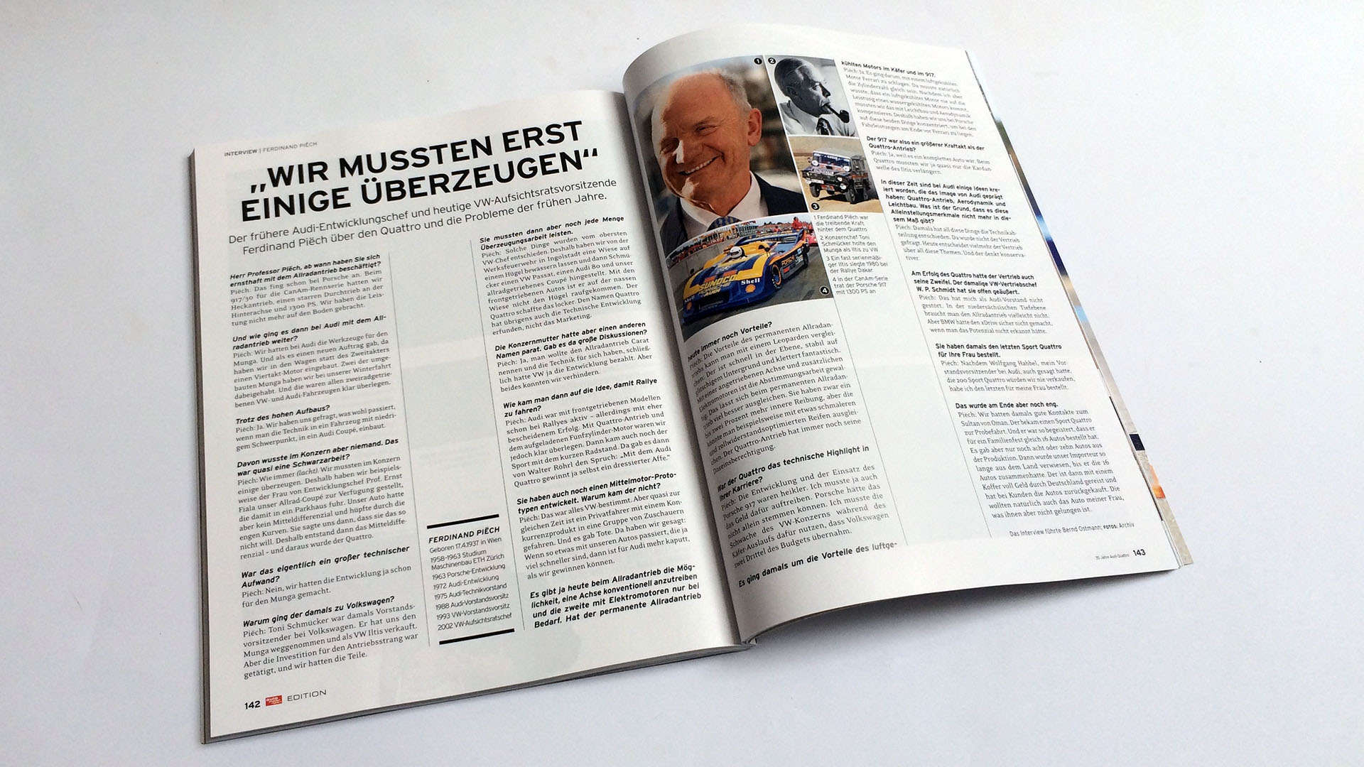 Einer der wichtigsten Köpfe bei der Entwicklung des Quattro-Antrieb war Ferdinand Piëch. In einem Interview berichtet er über die damaligen Entwicklungen und auch wie er sich den letzten aller Sport quattro für seine Frau sichern konnte, obwohl der Sultan von Brunei nach Produktionsende noch 16 Exemplare für ein Familienfest erstanden hatte und einige Exemplare zurückgekauft werden mussten. Nicht so beim dem Exemplar von Piëch.