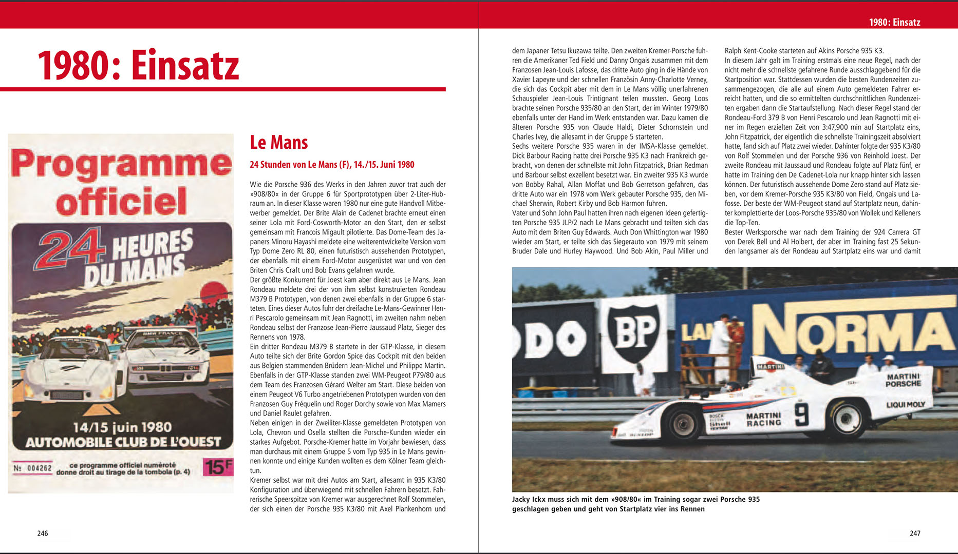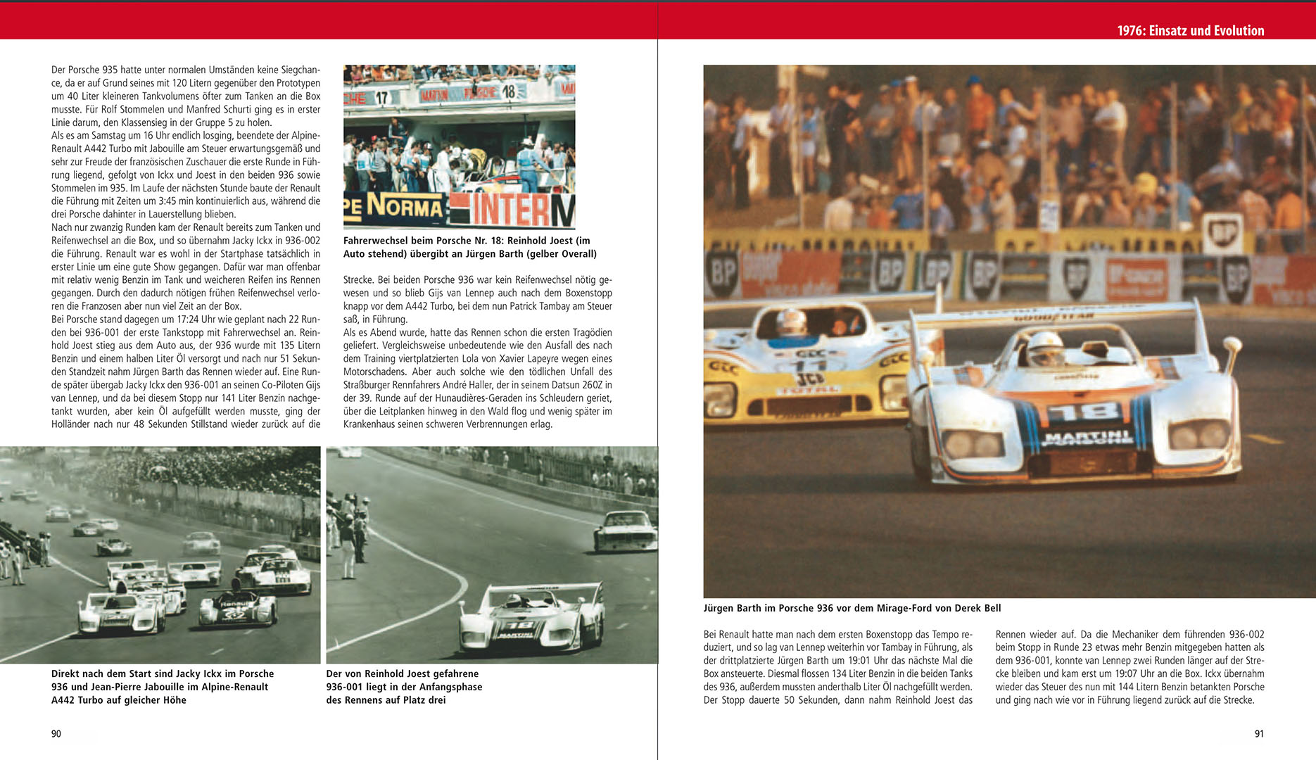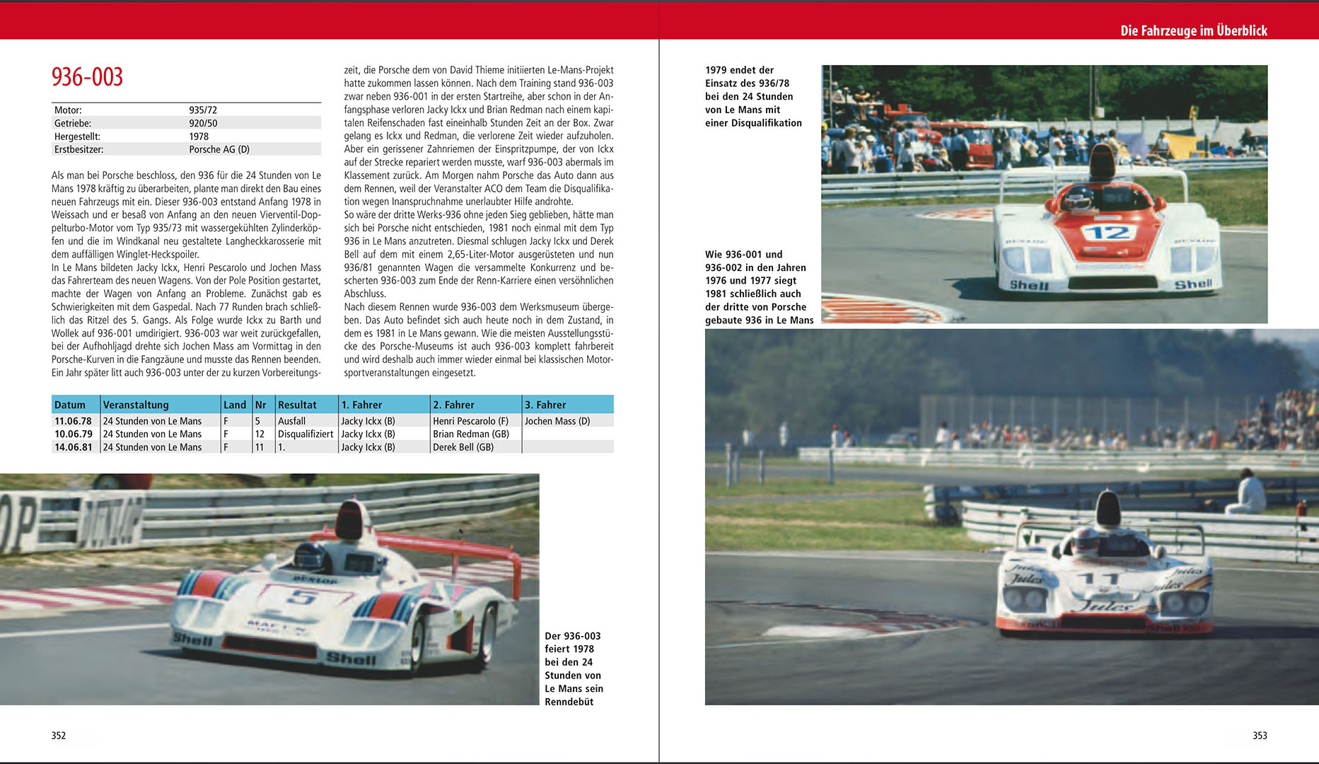Im Kernteil des Buches wird dann die komplette Historie des Porsche 936 gekonnt und mit viel Sachverstand dargeboten. Angefangen im Jahr 1976 als die Einteilung der Rennklassen abermals geändert wurde bis zum letzten Einsatzjahr 1981 in dem die letzte Evolutionsstufe des 936 noch einmal in Le Mans erfolgreich war. Die einzelnen Jahre werden nach dem bekannten Schema aus dem 934/935-Titel unterteilt in Entwicklung und den entsprechenden Renneinsätzen. Jeder Rennverlauf der Rennen an dem ein Porsche 936 teilnahm wird dem Leser erzählt. Die entsprechenden Ergebnislisten sind da natürlich obligatorisch.