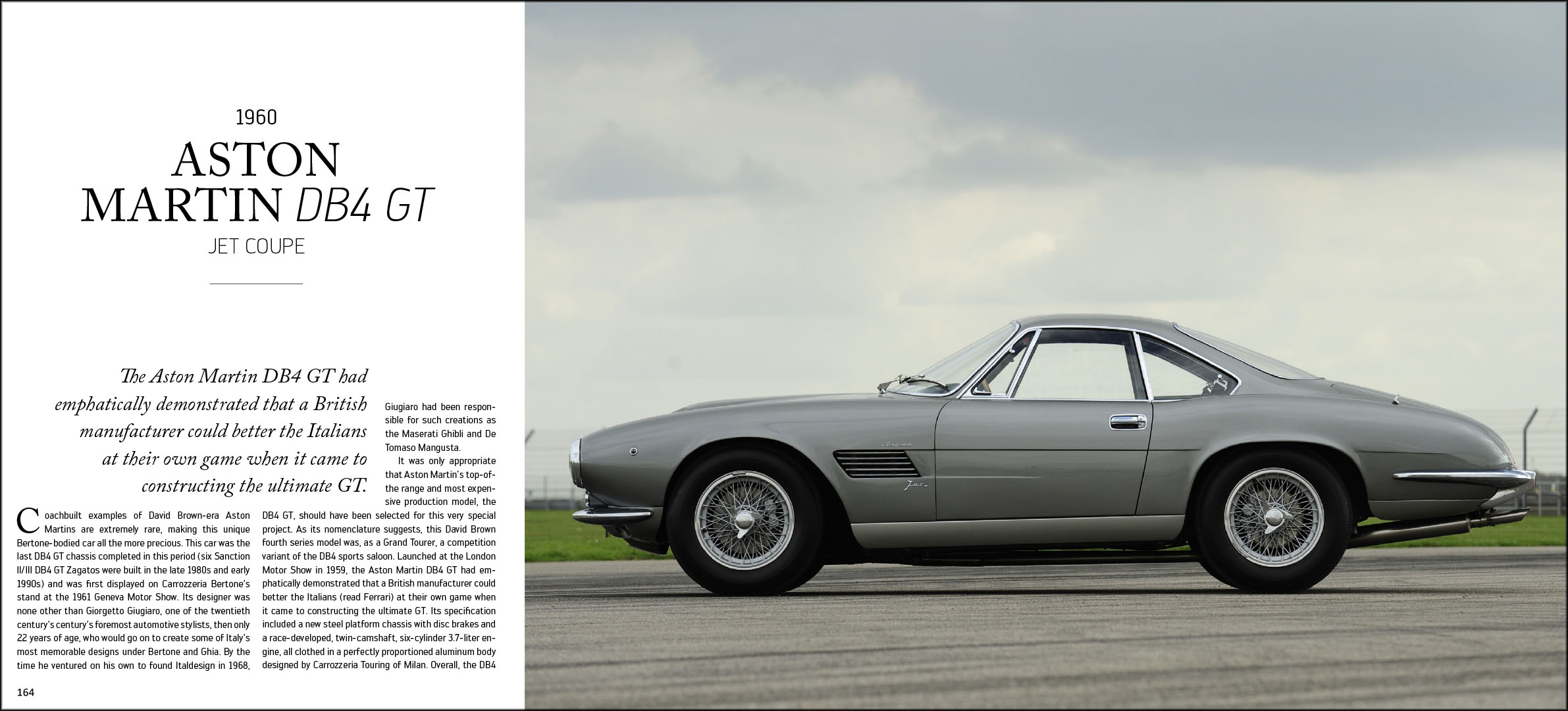 Auf dem Weg in die Gegenwart spielten die 60er Jahre im Automobilbau eine tragende Rolle. So wird dieser Dekade zu einem einzelnen Kapitel erhoben und gleich 15 Modelle werden vorgestellt. Darunter auch wieder einige einmalige Modelle wie der Jaguar E2A der die Verbindung zwischen D-Type und E-Type darstellte. Aber auch weitere beeindruckende klassische Modelle wie der ebenso einmalige Aston Martin DB4 GT Jet werden vorgestellt. Erfreulicherweise ist das Spektrum beeindruckend groß und so bietet das Buch neben einem Austin Mini Cooper auch den aktuellen Rekordhalter der erzielten Auktionspreise – einen Ferrari 250 GTO. Dieser erzielte auf der Quail Lodge Auktion 2014 einen Preis von $38,115,000.