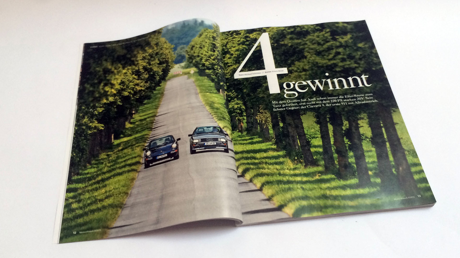 Aber zunächst zum regulären Heft: Da lockt der Titel schon mit einem späten Audi quattro 20V und einem Porsche 911 Carrera 4. Ein toller Vergleich der sportlichen Allradfahrzeuge erwartet den Leser. Audi machte dem quattro mit dem 20-Ventiler nochmals Beine und der Porsche aus der Serie 964 brachte zum ersten Mal den Allradantrieb in einen Serien-911er. Mit der bekannten Kaufberatung für beide Modelle werden die Autos kompetent vorgestellt.