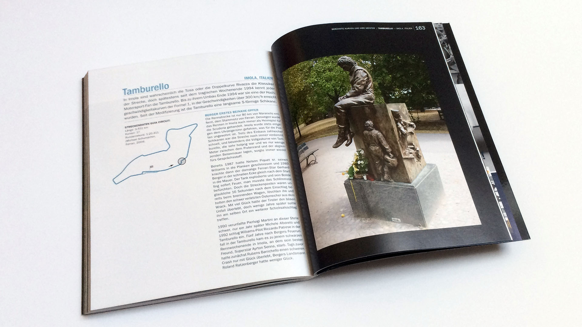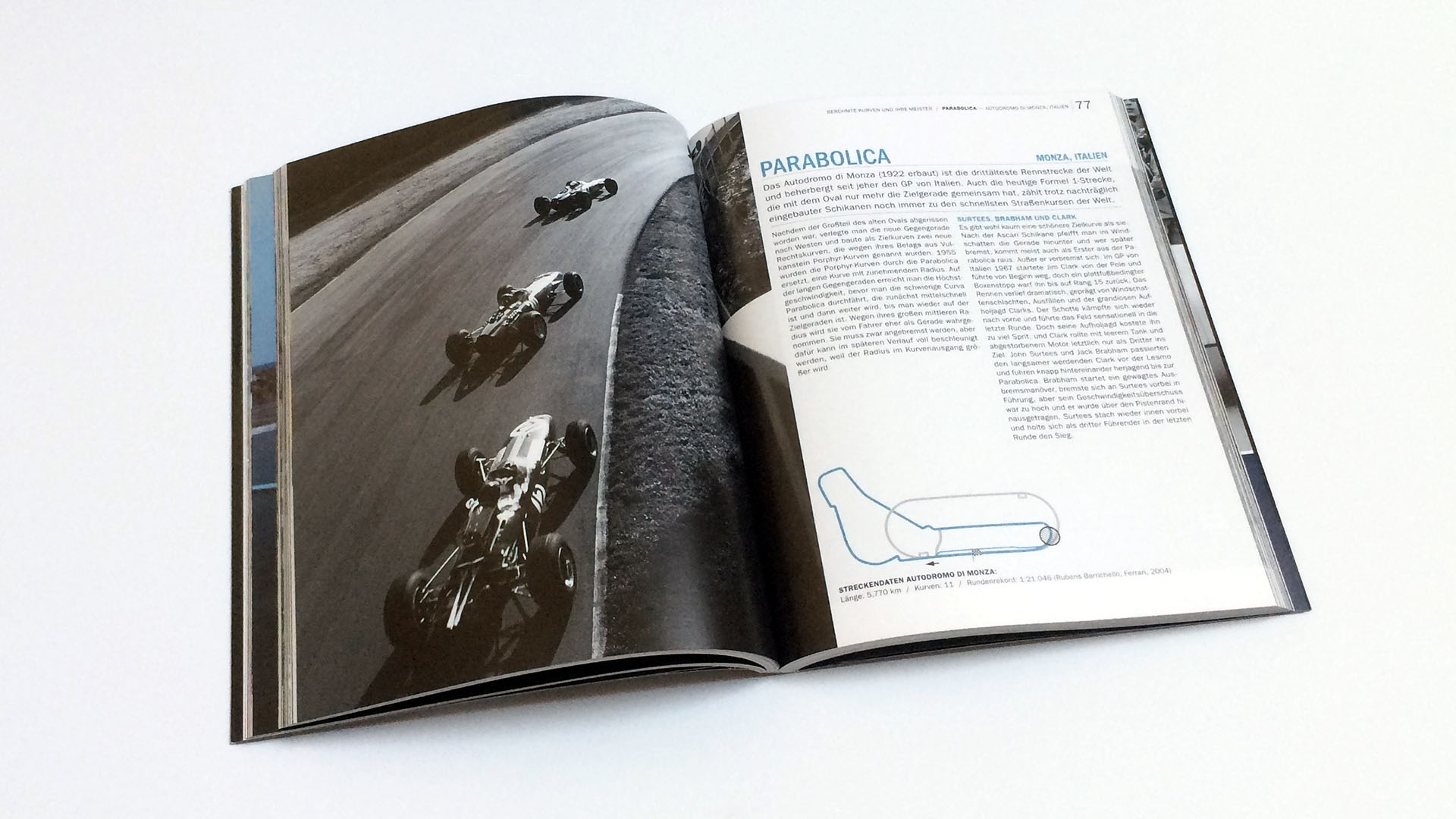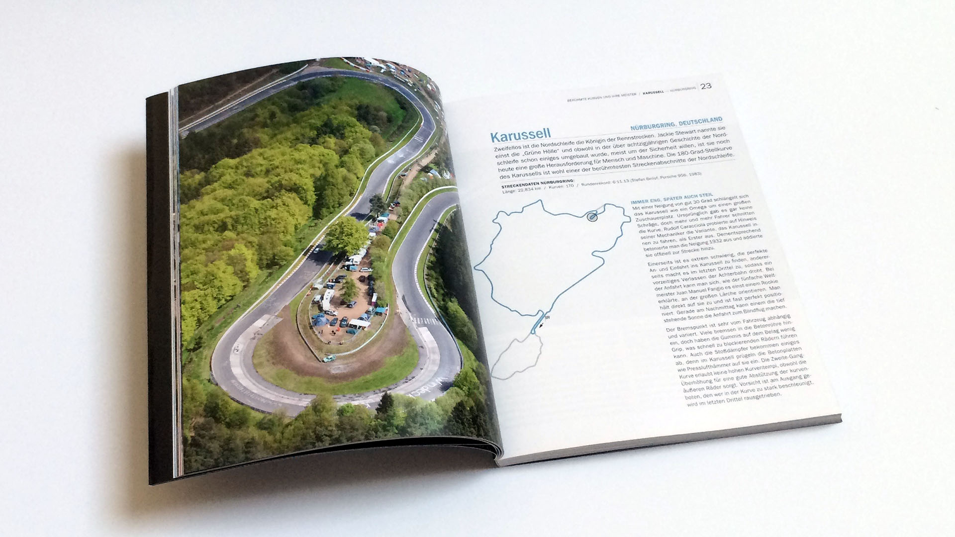Das Buch widmet jeder Kurven einen eigenen Bereich der zu Beginn neben den Streckeninformationen eine Skizze zur leichteren Orientierung auf der Rennstrecke bietet. Der Text wartet mit ausführlichen Erläuterungen zu jeder Kurve auf und wirft auch einen Blick auf die wichtigsten Vorkommnisse im Laufe der Zeit in der vorgestellten Kurve.