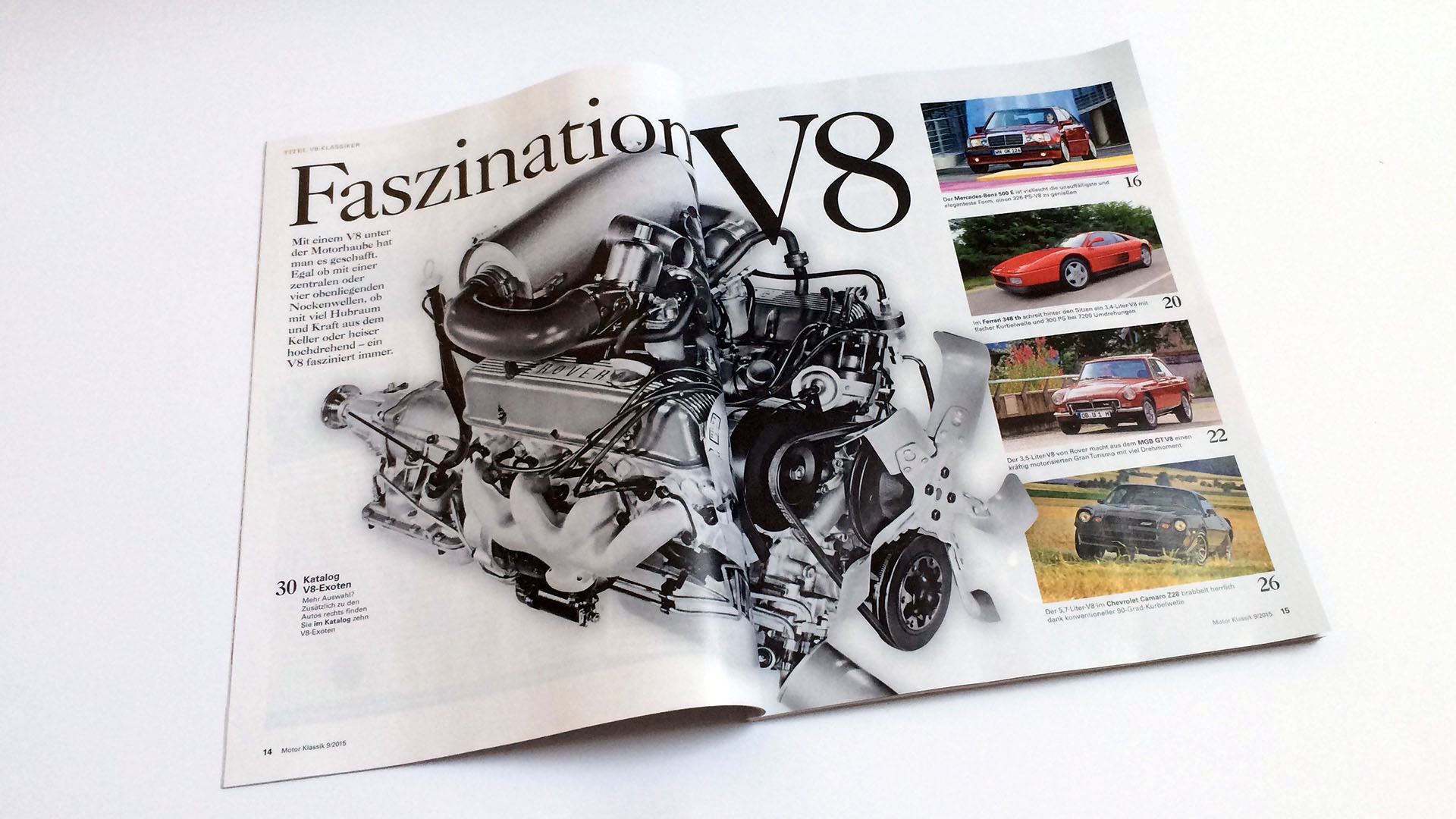 Unter der Überschrift „Faszination V8“ stellt das Magazin in gewohnter komptenter Art und Weise vier Fahrzeuge mit V8-Power ausführlich inklusive Kaufberatung vor. Neben den unauffälligen „Sleeper“ Mercedes-Benz 500 E kommt auch der kleine Ferrari 348 tb, der günstige MGB GT V8 und der brutale Chevrolet Camaro Z28 zum Zuge. Ein breites Spektrum wird also vorgestellt und für jeden Geschmack ist etwas dabei. Weitere 10 Exemplare werden wie gewohnt kurz vorgestellt dabei sind Autos aus den USA, Schweiz, England, Italien und Spanien.
