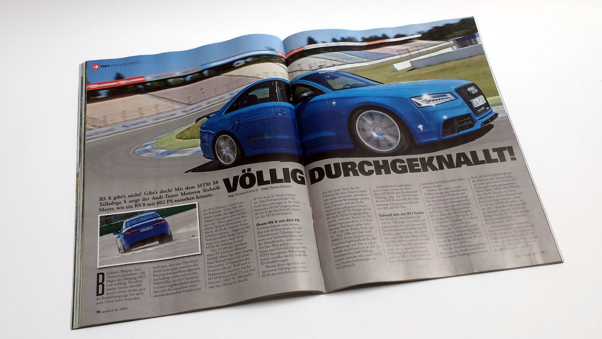 Da Audi sich bis heute noch nicht zu einer RS-Variante seiner großen Limousine A8 durchgerungen hat, zeigen die Tuner von MTM mit dem S8 Talladega S eine mögliche Ausbaustufe des angebotenen S8. Die wie immer kompromisslose Umsetzung von MTM wird in einer limitierten Auflage von nur 25 Exemplare hergestellt und bietet beeindruckende 802 PS bei einer Maximalkraft von 945 Nm. Der Vortrieb endet so erst bei 350 km/h und dieser wird nur noch vom Digitaltacho angezeigt, da die analoge Version nur bis 320 km/h reicht. Auf der Autobahn ist diese große Limousine ein wahrer Genuss bescheinigt Testredakteur Christian Gebhardt. Auf der Rennstrecke allerdings sind die 2051 kg einfach zu viel Ballast und zudem ist das ESP nicht vollständig deaktivierbar. So erreicht der S8 Talladega S auch nur eine Zeit von 1:13,6 min in Hockenheim – der RS 6 aus Ingolstadt ist lediglich zwei Zehntel langsamer. Wohl auch ein Grund warum bei Audi auf den RS 8 verzichtet wird.