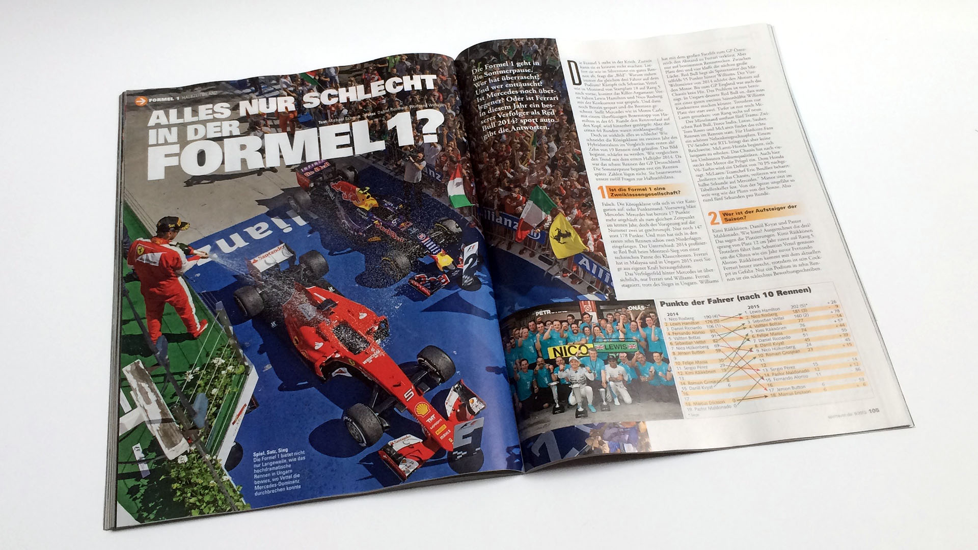 Im Motorsport-Bereich startet das Heft mit einer kritischen Analyse der bisherigen Formel 1-Saison die sich erst nach dem Erscheinen des Heftes aus der Sommerpause zurückgemeldet hat. So analysiert Michael Schmidt in 12 Fragen die Entwicklungen der aktuellen Saison – vieles im Vergleich zur vorherigen Saison. Dazu gibt es eine Menge an Vergleichsgrafiken die viele Entwicklungen nochmals sehr anschaulich verdeutlichen. Tolle Analyse!