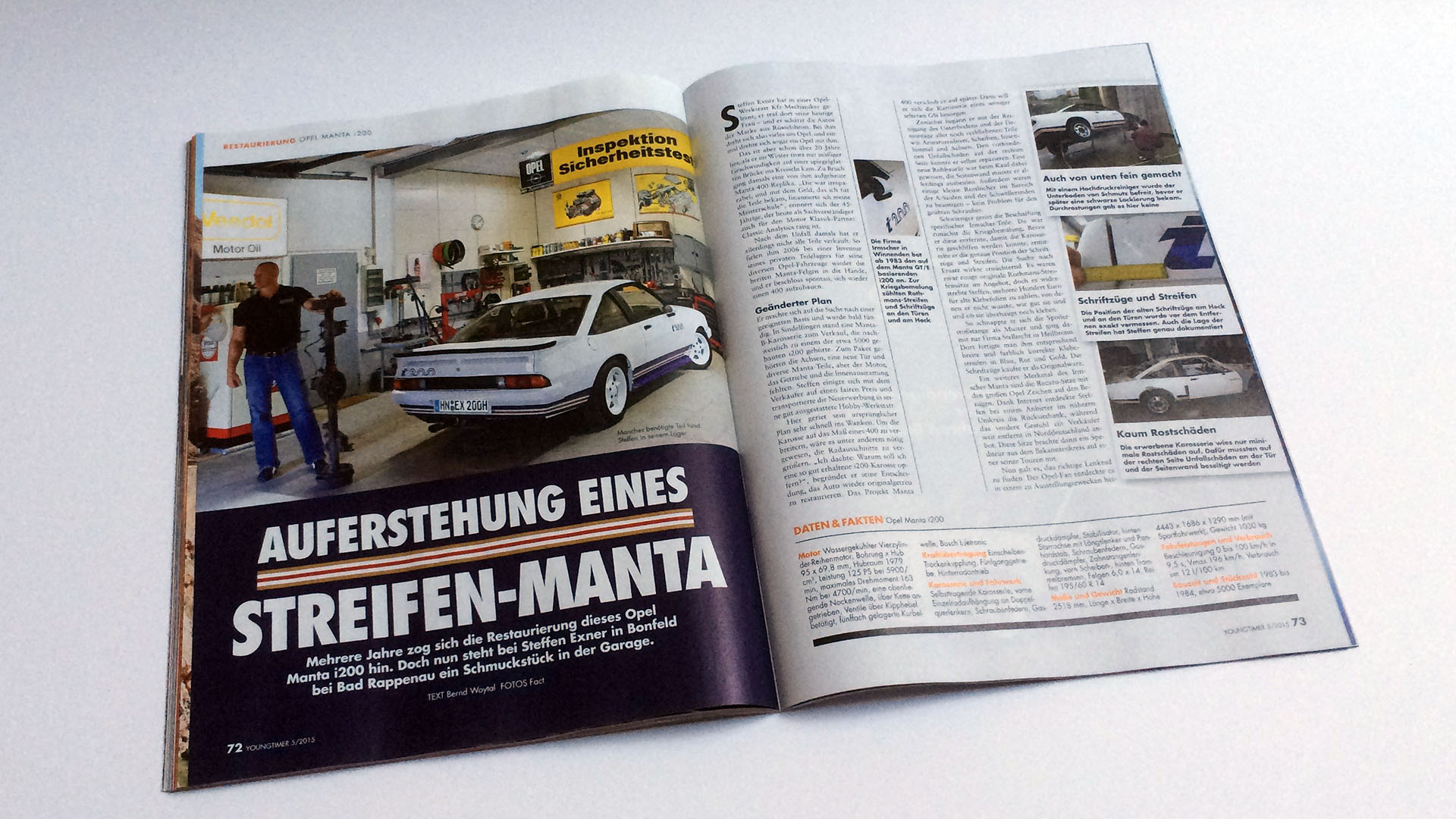 Einen seltenen Opel Manta i200 restaurierte Steffen Exner von 2008 bis 2015 – allerdings mit Pausen. Zunächst wollte Exner den i200 zum Aufbau eines Manta 400 nutzen entschied sich aber für die nicht minder attraktive Variante i200 und baute ihn wieder auf. Dabei half ihm sein großes Lager und auch die handwerkliche Fähigkeiten. Der Manta erhält nach dem Fototermin noch den Original-Motor und kommt seinem Originalzustand somit immer näher. Auf den Bildern wirkt die Umsetzung mit den Rothmans-Streifen schon sehr gelungen!